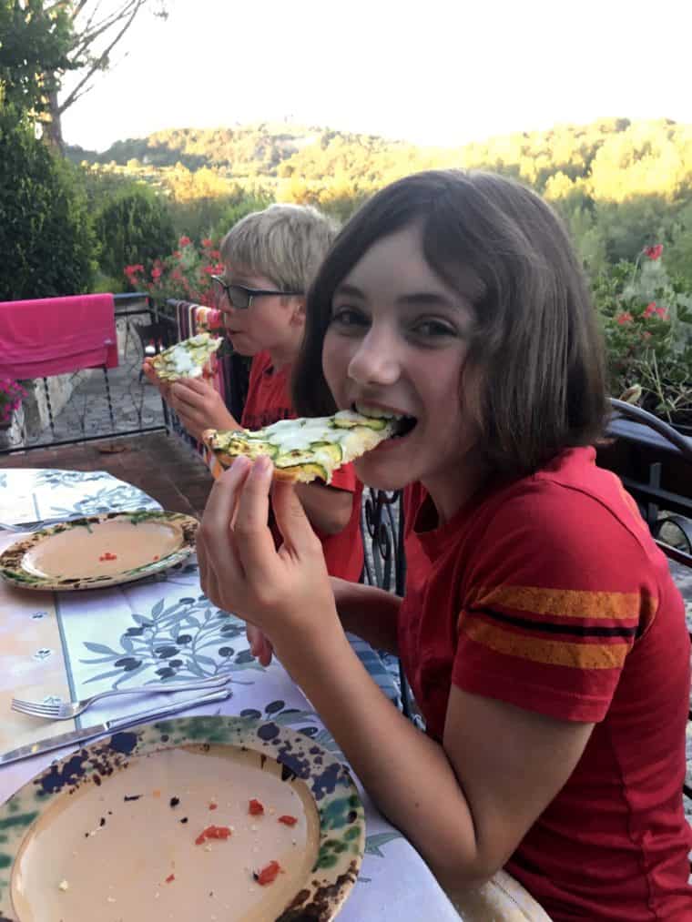 While they cooked the pizzas, my family sat down at the dining table outside on our patio. We all chatted, and made jokes about each other, and admired the beautiful views. Cupcake and Steve decided to run off to play hide and seek, or whatever they were doing, and for a while, we sat in silence, deep in thought. Then, the first pizza came out of the oven and found it’s way onto the table.