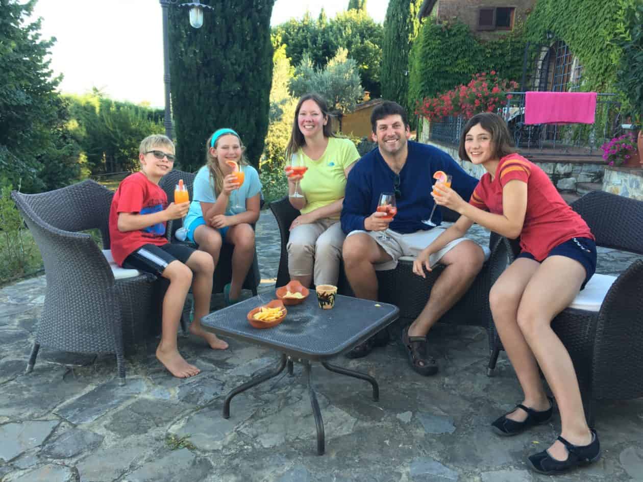 Soon after, Lucia declared that it was “Happy Hour” and that they had brought drinks for all of us (“Happy Hour” means a period of the day when drinks are sold at reduced prices in a bar, though I guess here it just meant that we were getting drinks). We sat outside, discussing how much work needed to be put into just the making of the dough, and enjoying the view, when Lucia came out with the drinks. Of course, only Mom and Dad got the wine that Lucia’s father made, while the three of us kids got the multi-fruit juice we had seen before, mixed with fizzy water. The result of my drink was amazing! The sweet fruit juice mixed with the hard edge of the fizzy water and a squeeze of grapefruit made the drink go “POW!” in my mouth with every sip. “Delizioso,” I had told Lucia, which is Italian for “Delicious”.